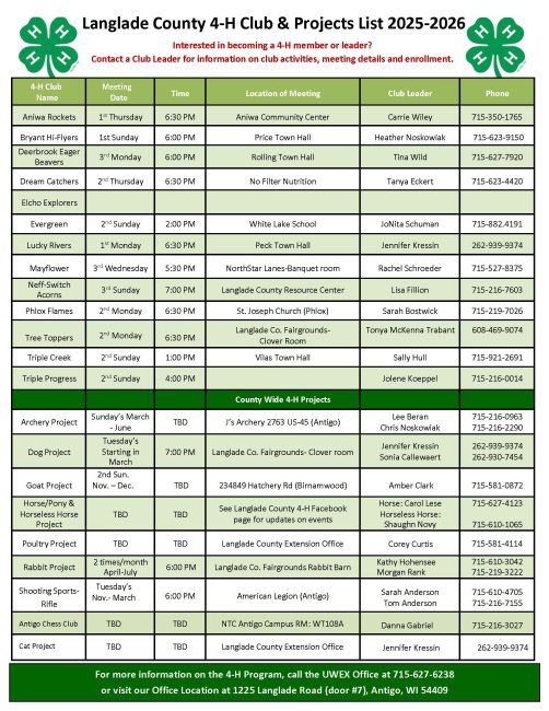 For a listing of all Langlade County 4-H Clubs or Projects and their meeting times, please click on the link below.